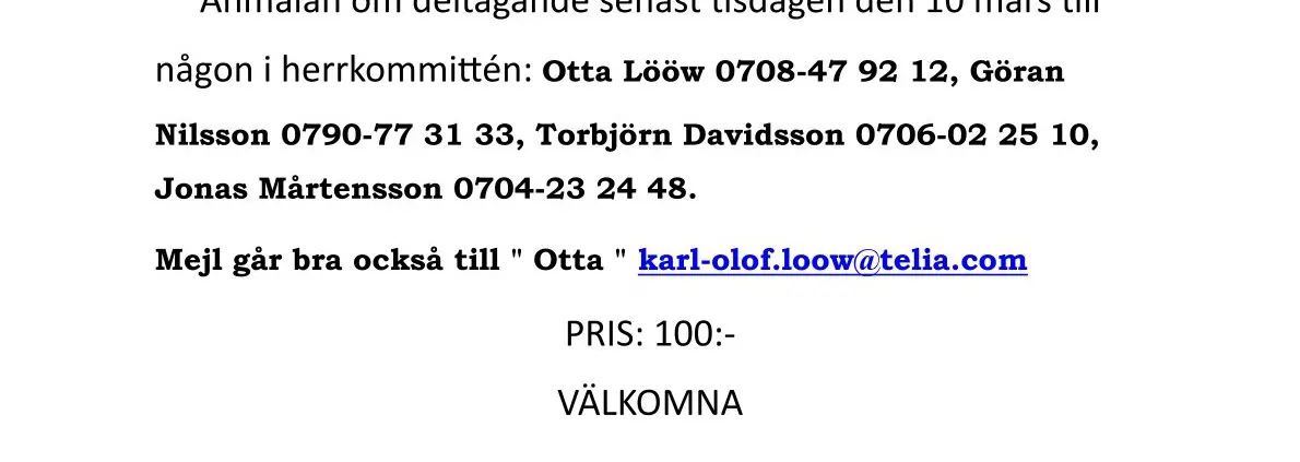 Anmälan om deltagande görs senast tisdagen den 10 mars till någon i herrkommittén: